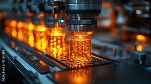 Bottles move on a conveyor belt in a factory with bright orange light.