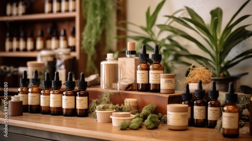 Bottles of Essential Oils on a Wooden Shelf