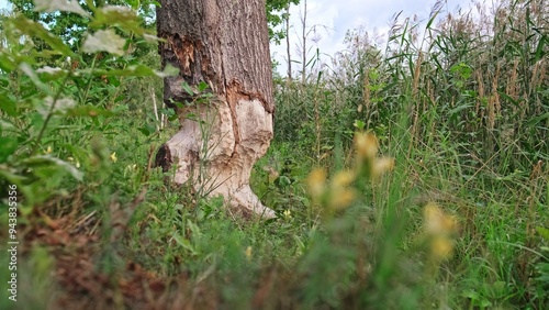 Bottom of Thick Tree Trunk Chewed Gnawed Damaged by Wild Beaver