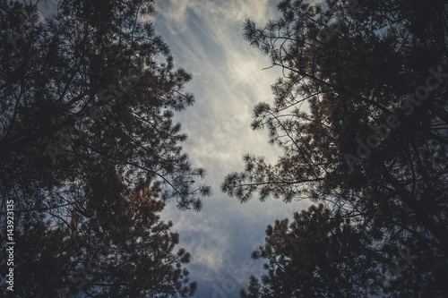 Bottom view of tall old trees in evergreen pine forest. Scenic view.