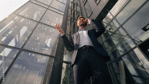 Bottom view smiling successful business man talking mobile phone happy discuss work deal with smartphone businessman male speaking cellphone consulting client communicate in city near office building