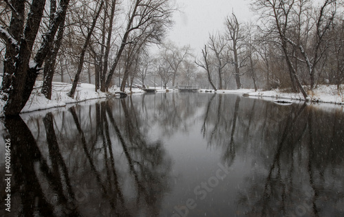 Boulder Colorado River During Winter Season, Downtown Trees Reflection in River