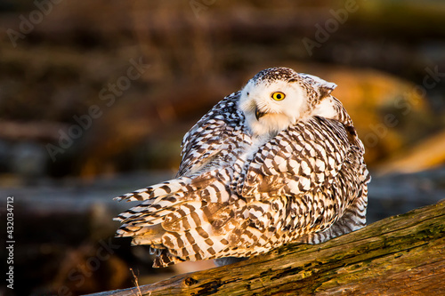Boundary Bay Regional Park, British Columbia, Canada: A portrait of a snowy owl while pausing from preening.