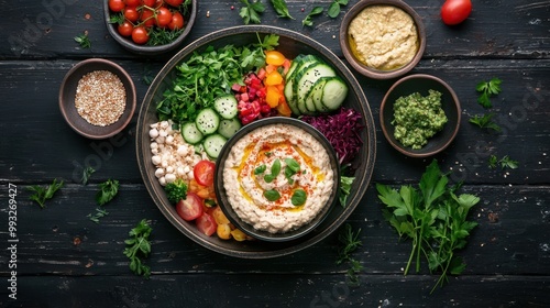 Bountiful Vegan Platter with Dips and Fresh Vegetables on Rustic Table Setting, Promoting Healthy Eating and Communal Dining Experience