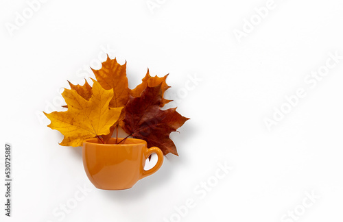 Bouquet of autumn leaves in a ceramic yellow cup. White background with a place to copy.