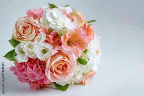 Bouquet of colorful roses and white flowers arranged beautifully on a plain white background