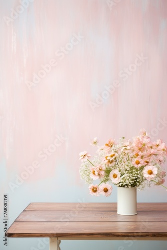 Bouquet of flowers in vase on table against color wall.