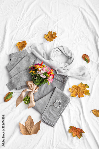 Bouquet of flowers with autumn clothes, accessories and fallen leaves on white fabric background