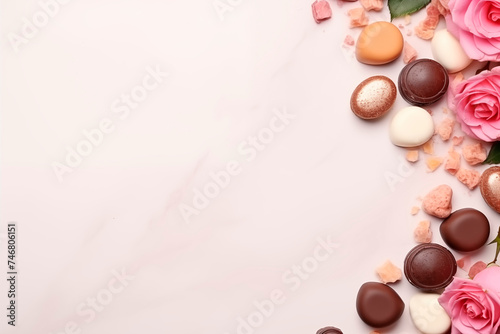 bouquet of pink roses and candy. background for valentine's day, birthday, holiday. A beautiful bouquet for congratulations.