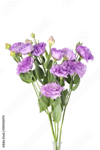 Bouquet of violet eustoma flowers with green leaves isolated on white