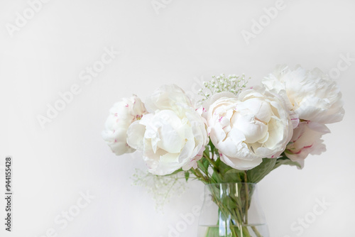 Bouquet Of White Peonies Standing In A Glass Vase On A White Background