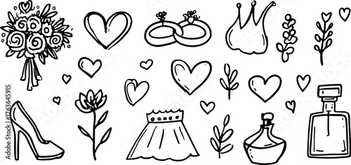 Bouquet, rings, and shoe in hand-drawn style. Black outline vector illustration featuring wedding and fashion elements in a creative set.