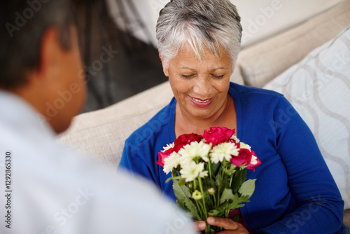 Bouquet, smile and flowers with old couple in living room for romance, bonding and anniversary date. Happiness, retirement and relax with senior man and woman at home for present, love and marriage