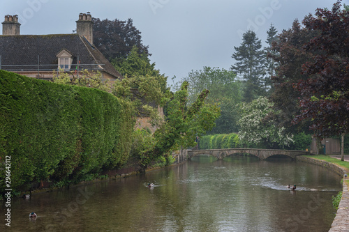 BOURTON-ON-THE-WATER, COTSWOLDS, UK - MAY 28, 2018: Stone footbridge across the River Windrush in Bourton-on-the-Water, also known as The Venice of the Cotswolds - Gloucestershire - England -UK