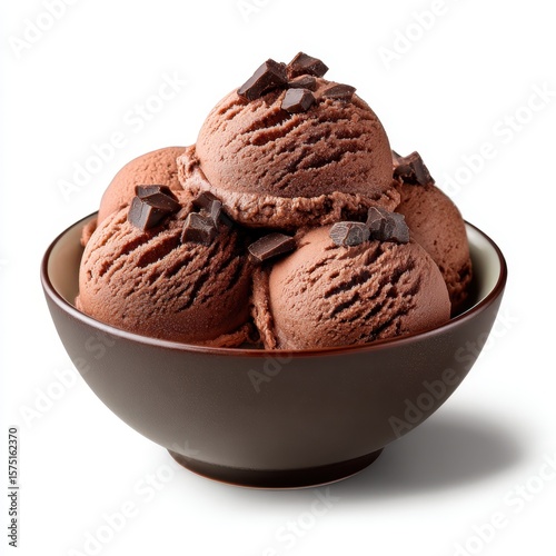 Bowl filled with chocolate ice cream scoops topped with chunks isolated on white background.