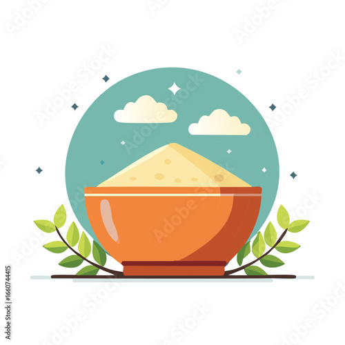 Bowl filled with yellow grains and a peaceful sky with fluffy clouds in a calming landscape design
