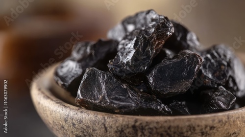 Bowl full of Shiny Black Garlic cloves presented on a rustic wooden bowl