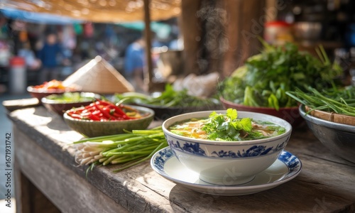 Bowl of Asian noodle soup, market setting