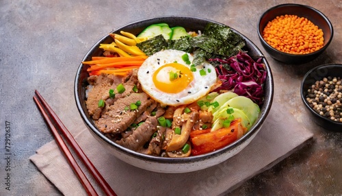 Bowl of bibimbap meal with meat, rice, vegetables and egg. Tasty Korean cuisine.