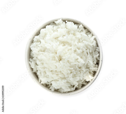 Bowl of boiled rice on white background, top view