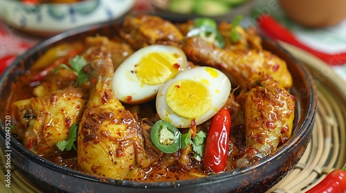 Bowl of Chicken Stew with eggs. The stew is made with chicken, eggs, and spices, and it is served in a brown bowl. The chicken is cooked until it is tender, and the eggs are soft-boiled.