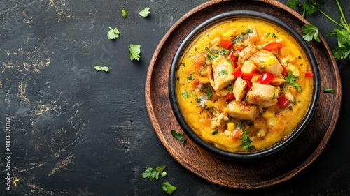 Bowl of chicken stew with vegetables and parsley on rustic table