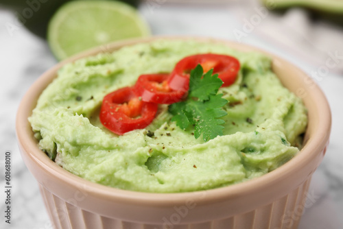 Bowl of delicious guacamole with chili pepper on white table, closeup