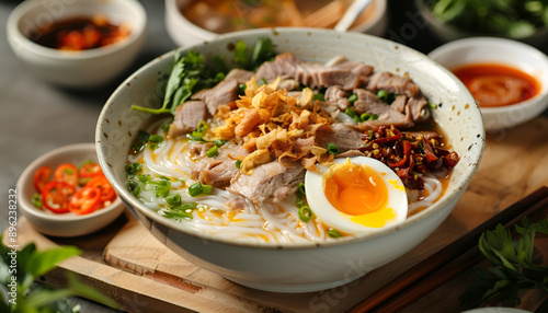 Bowl of delicious rice noodle soup with meat and egg on wooden board, closeup