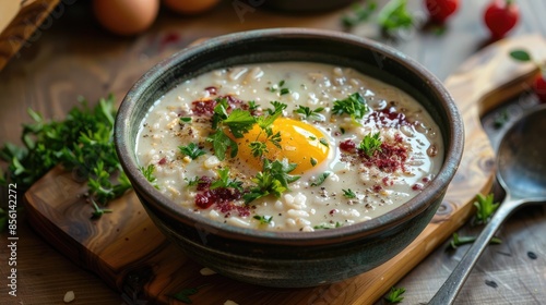 Bowl of Egg Topped Homemade Rice Berry Soup