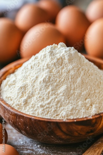 Bowl Of Flour. Brown Eggs In The Background. Ingredients For Baking. Wooden Background.