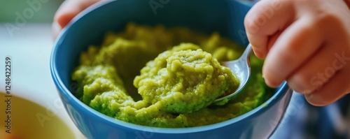 Bowl of fluffy green mashed potatoes with a spoon. baby meal.