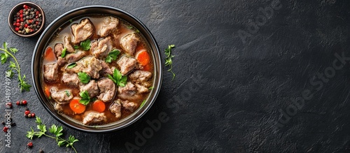 Bowl of fresh meat soup on a dark background top view. with copy space image. Place for adding text or design