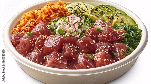 Bowl of fresh poke with fish, vegetables, and toppings.