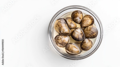 Bowl of fresh round clams in clean water top view with empty space on a white background for culinary and seafood presentations