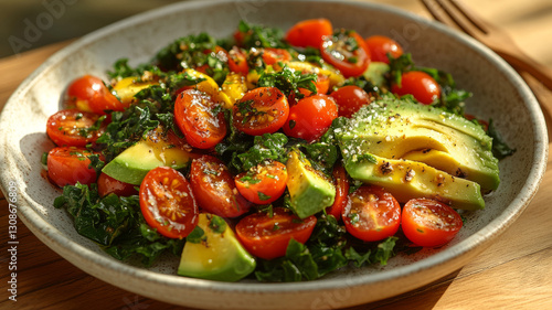 Bowl of fresh salad with avocado, tomatoes, and kale.