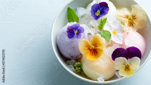 Bowl of frozen treats with minimal edible flowers, top left margin