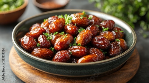 Bowl of Glazed Dates with Fresh Herbs in a Rustic Kitchen Setting