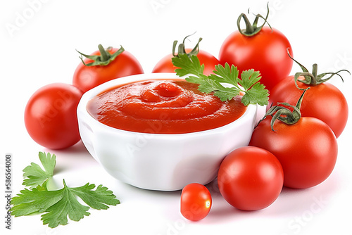 Bowl of ketchup or tomato sauce with ingredients on white. Generative Ai