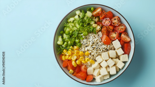 Bowl of mixed vegetables, tofu cheese and groat. Gourmet and nutritious vegan meal. Healthy eating concept