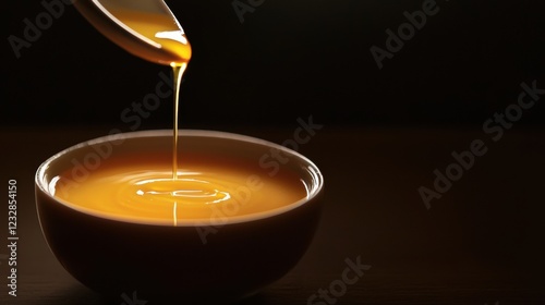 Bowl of orange-colored liquid being poured from a white spoon into it. the liquid appears to be a smooth, creamy texture and is flowing from the spoon into the bowl.