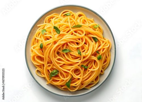 Bowl of plain spaghetti pasta with tomato sauce and sprinkled green herbs on white background