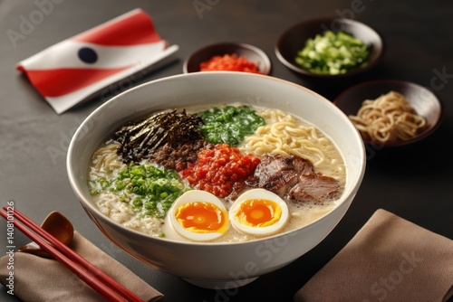 Bowl of ramen with various toppings and chopsticks on a dark surface.