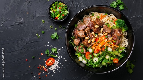 Bowl of ribs noodles with vegetables, top view, bright colors, warm atmosphere, natural light, vibrant food photography