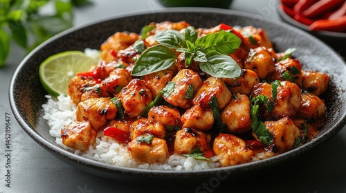Bowl of rice topped with chicken and vegetables garnished with basil and lime.
