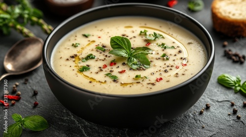 Bowl of soup garnished with fresh herbs and spices on a wooden table
