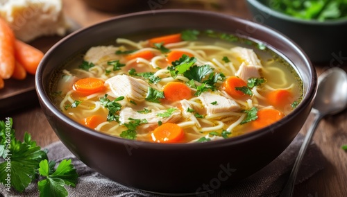 Bowl of steaming chicken noodle soup, garnished with carrots and fresh parsley. A close-up view shows the light broth, cooked noodles, shredded chicken, and colorful carrots
