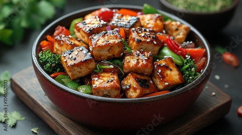 Bowl of tofu stir-fry with vegetables, sesame seeds, and red peppers.