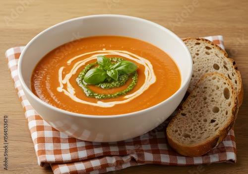 Bowl of tomato soup garnished with basil and cream served with sliced bread