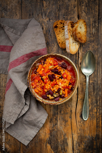 Bowl of vegan chili with red lentils, celery sticks, kidney beans, tomatoes andÔøΩcarrots
