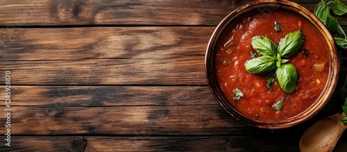 Bowl of vibrant tomato soup garnished with fresh basil on a rustic wooden background with empty space for text and design elements